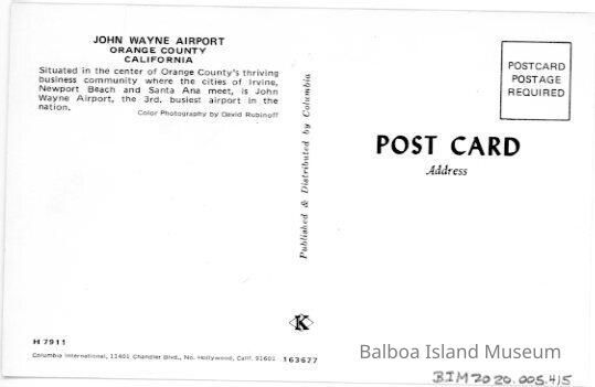 A color postcard of the old sign at the John Wayne Airport in Orange County. This was when the airport was still one terminal.