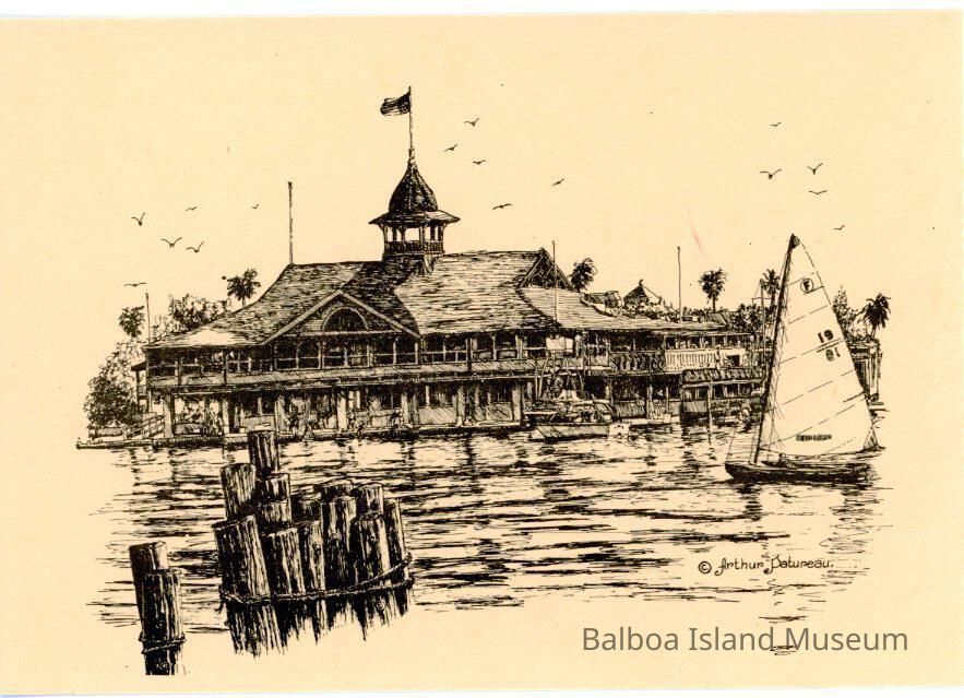 A thin postcard of a sketch of the Balboa Pavilion done in thin ink lines by Arthur Patureau. Done from a jetty or boat on the water with a mooring post of some kind to the left of the artist.