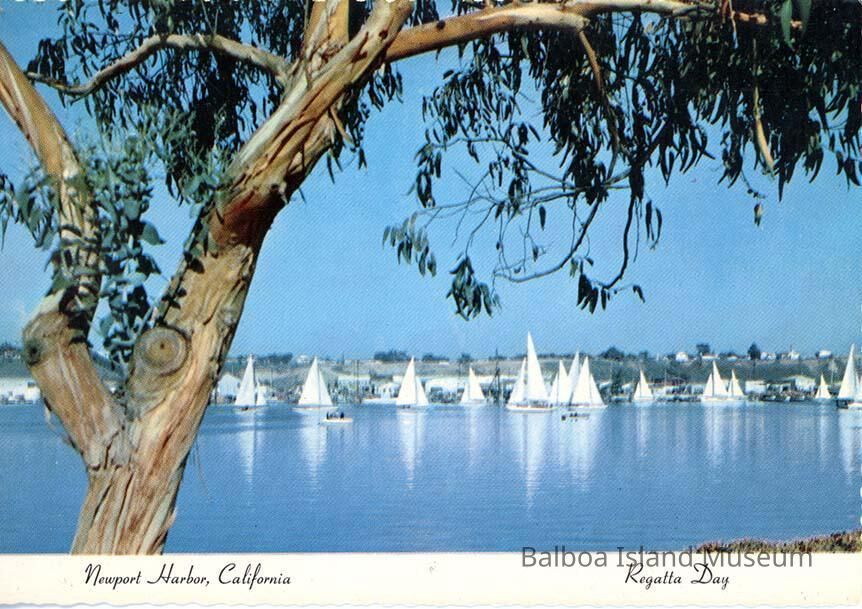 A color postcard of sailboats on the harbor with a eucalyptus tree to the left. The sailboats are likely engaging in a race. There is a white banner below that reads "Newport Harbor, California Regatta Day.