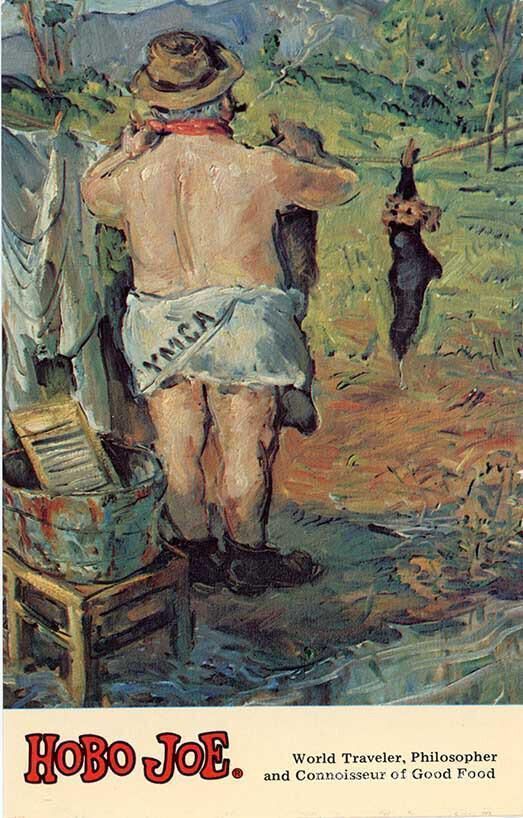 A color advertising postcard for Hobo Joe's, a cafe chain located in California and Arizona. The card features a painting or pastel sketch of Hobo Joe, the chain's mascot, hanging his laundry. His puppy is inside of a sock on the line, watching Joe pin a garment to a line. There is a YMCA towel around his waist and a smoking cigar in his mouth. A wash basin with a wash board are sitting on a chair to the front and a lake or river is visible along the bottom right. Joe is turned away from the front of the card. The card is vertically printed, with a banner across the bottom that reads "Hobo Joe" World Traveler, Philosopher, and Connoisseur of Good Food".
