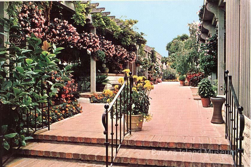 A color photograph postcard of the Garden Walk steps leading up into the garden with trellises and flower baskets lining the walk from the steps. The specimen shade garden is to the right and the tea garden is to the left.