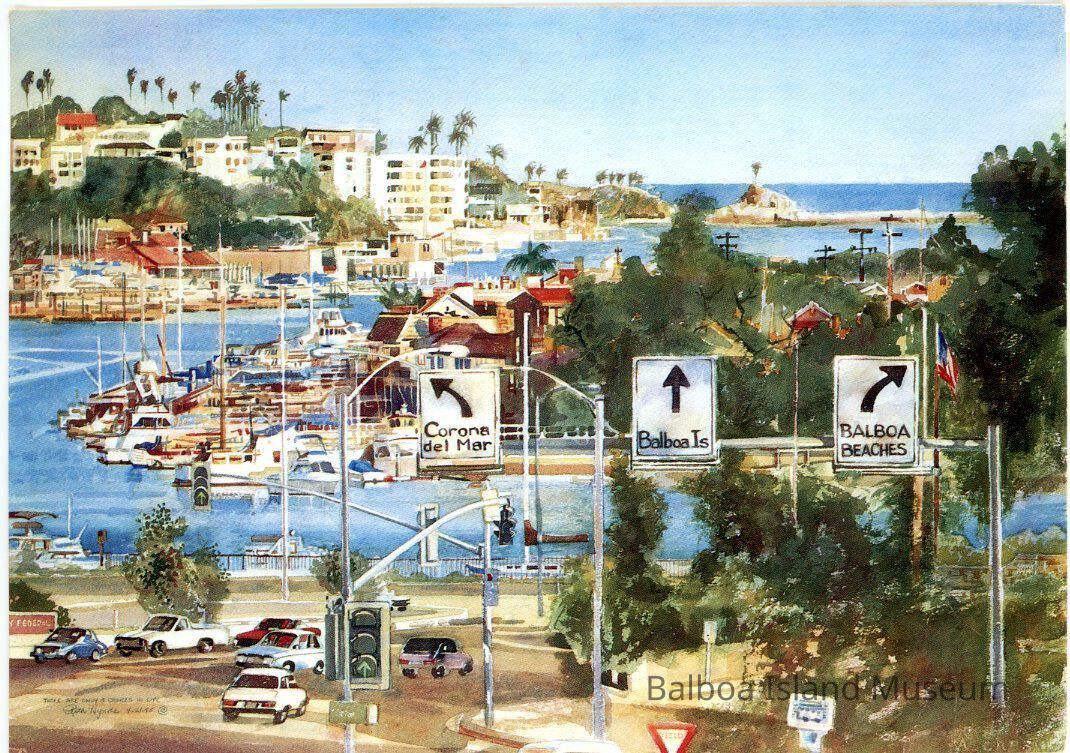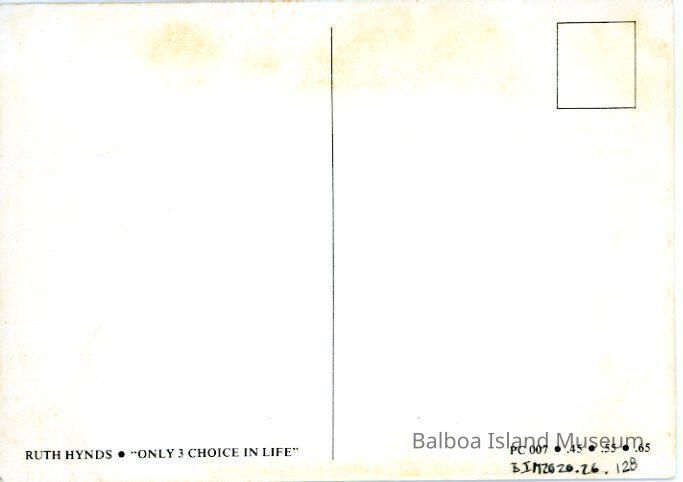 An oversized postcard featuring a painting by Ruth Hynds called ""Only 3 Choices in Life"". It is pained from the top of Jamboree looking down onto the harbor and the intersection for Balboa Island. There are three arrows off a street sign that reads ""Corona del Mar"" to the left, ""Balboa Is."" straight, and ""Balboa Beaches"" to the right. Balboa island sits behind it and Corona del Mar with the Balboa Yacht club and the harbor entrance area along the background.