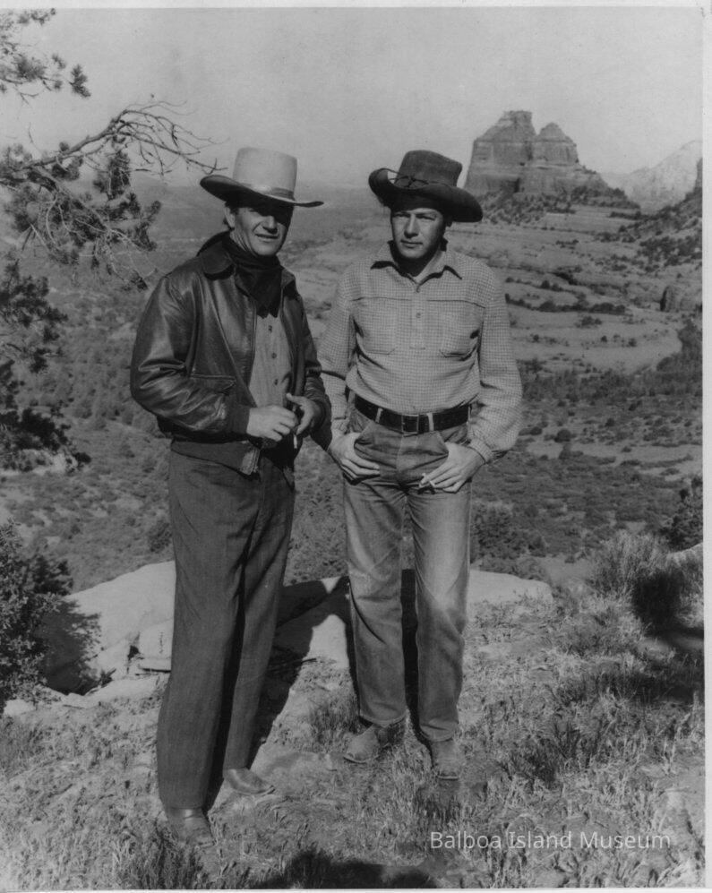 A photograph of the donor's uncle with John Wayne. He worked on a movie set with Wayne in Arizona. The photograph is a copy of the original, which the donor maintained.Her uncle was Wayne's stunt double.