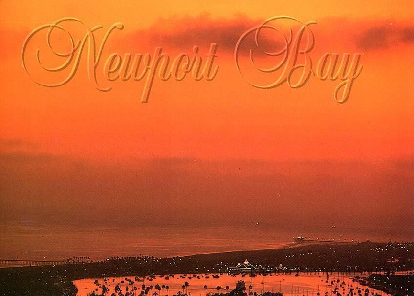 An aerial photograph of Newport Bay looking towards the horizon with Newport Bay along the bottom with a lit-up Pavilion. Taken at sunset with the water reflecting reddish orange off the water. "Newport Bay" is written across the top in semi-transparent cursive script.