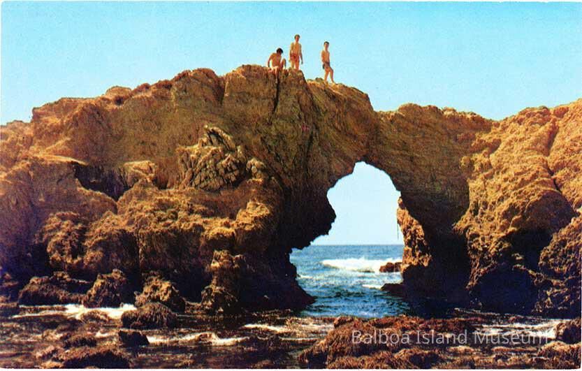 A color postcard of Arch-shaped rock at Corona del Mar beach with three boys on top of it.