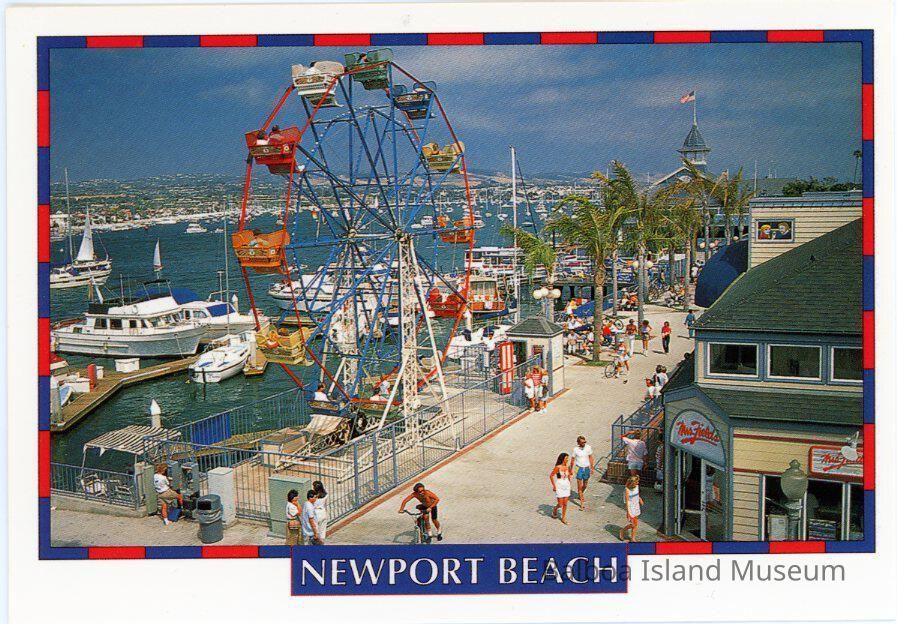 A color photograph postcard of the Fun Zone taken from the third floor of a nearby building. Features the Ferris wheel and and boardwalk. The Pavilion can be seen in the background. White boarder with a red-blue dashed frame. There is a blue box at the bottom that reads "Newport Beach" in white, letters.