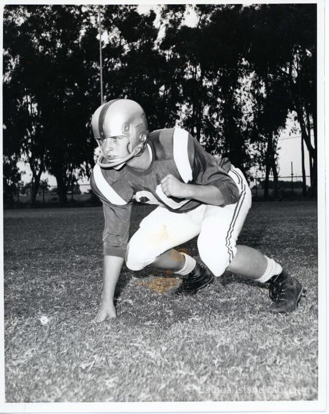 A photograph of Gary Caldwell in full football gear kneeling on the ground in a read position for a play. He may have been a quarterback based on the position he is in.