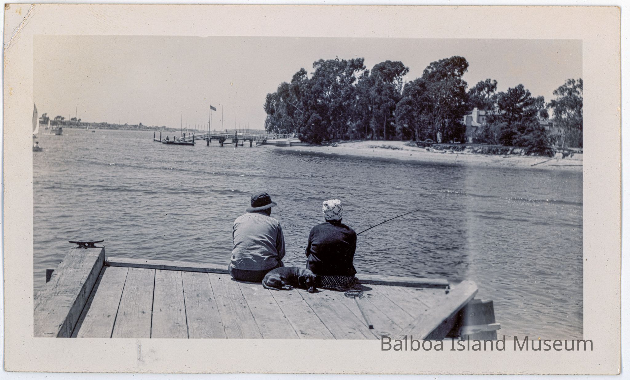 Two people fishing with the dog on the dock facing Harbor Island from Collins IslandPhotograph Details