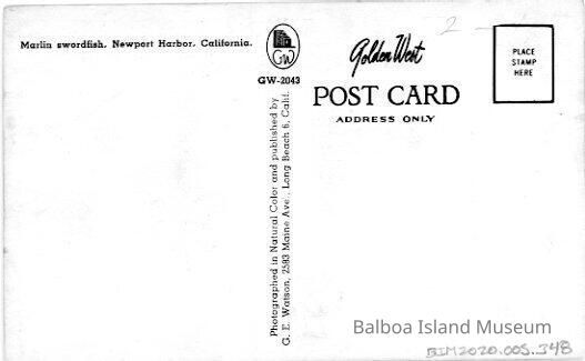 Unused. Published by George Elton Watson under Golden West in Long Beach. Photograph by George Elton Watson. Postcard number GW-2043.Subject