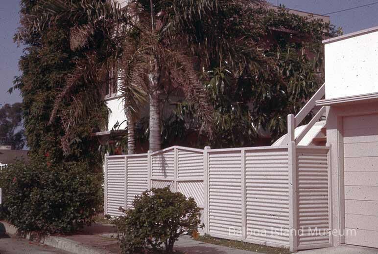 A small slide transparency processed by Rountree Color lab that features a photograph of the gate to 200 Grand Canal. The gate is located on the side of the house bordering Park Avenue. It's a pink gate located next to the exit of the bridge between the house and the detached garage.