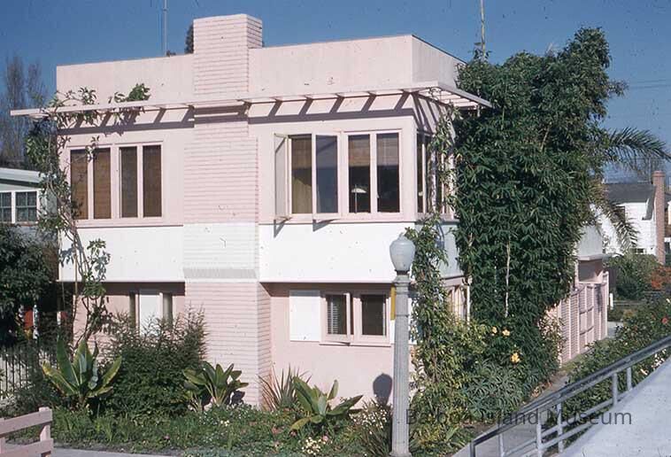 A small slide transparency featuring a photograph of 200 Grand Canal. The house is pink with a white central brick accent. It is taken in front of the house in October, 1952.