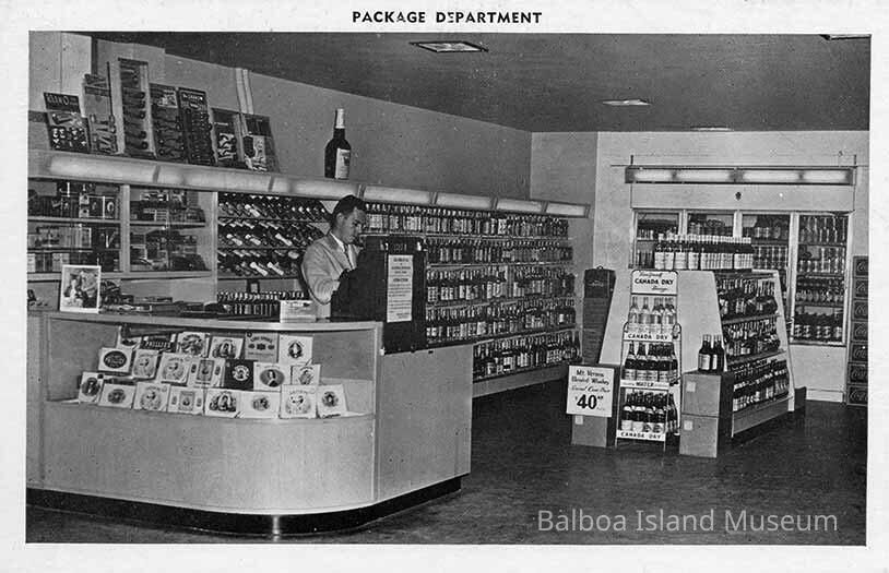 A black and white photograph of the package department inside Richard's Lido Market. There is a man behind the register and bottles of whine and liquor covering the walls and shelves. There is pipe tobacco and pipes behind the counter and cigars inside the counter case. White border.