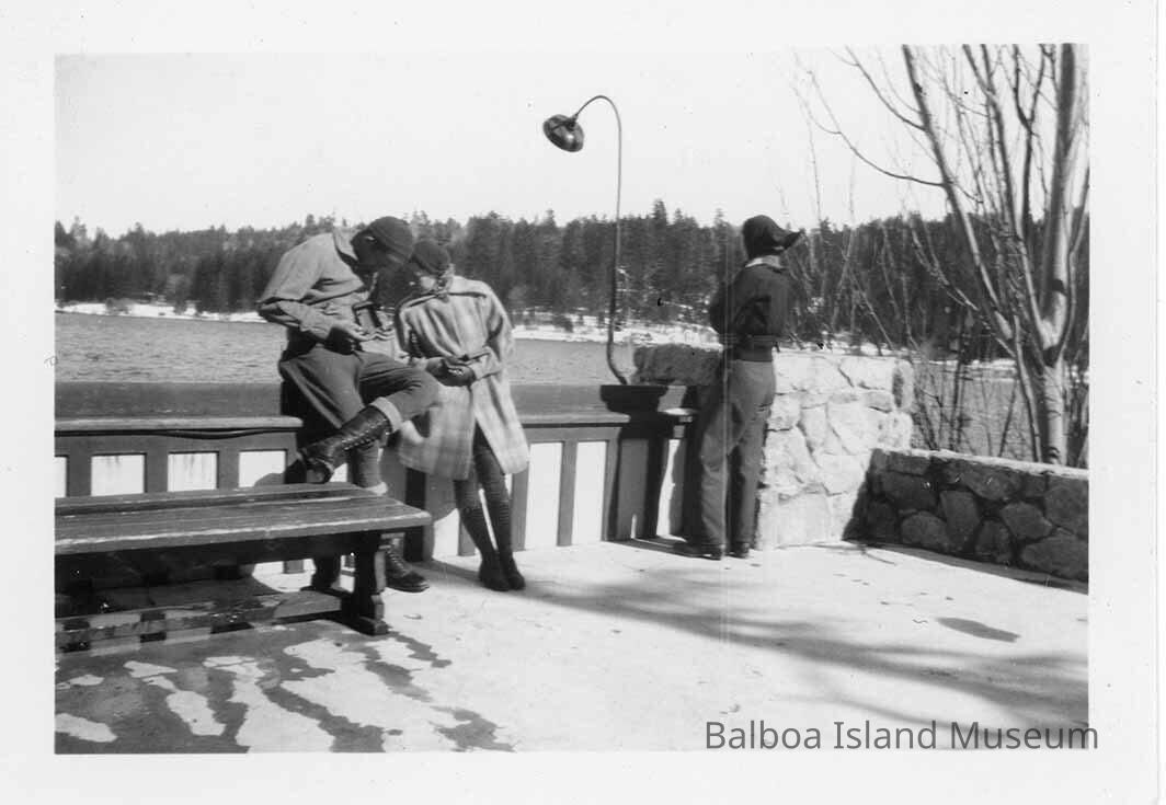 A black and white photograph of three people standing on a platform at the edge of what might be Lake Arrowhead in the winter. Probably two women and a man. The woman and man standing close together may be Harold and Helen Caldwell.