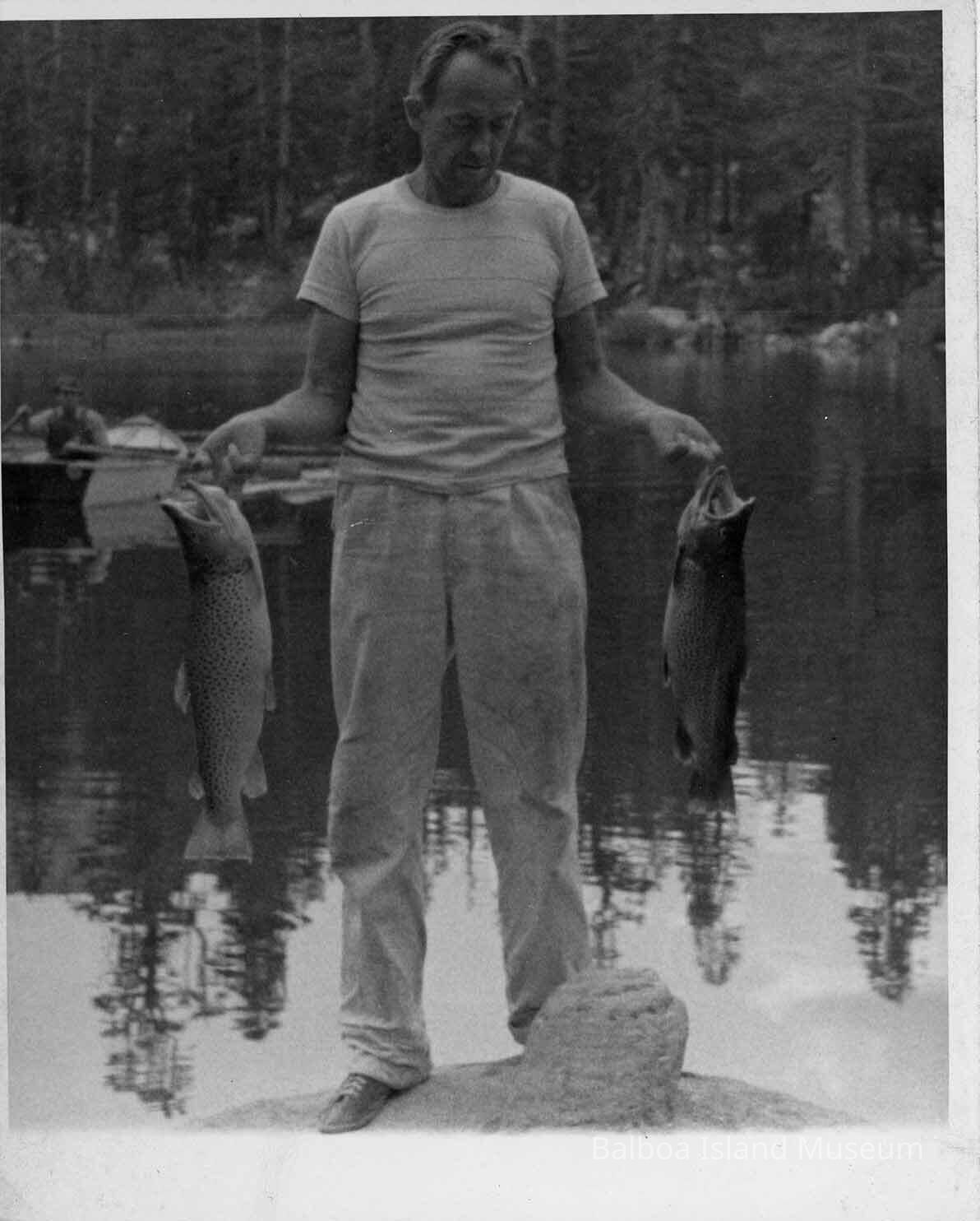 A black and white photograph of Harold Caldwell with two fish on the shore of a lake, probably Lake Arrowhead. Larger print.
