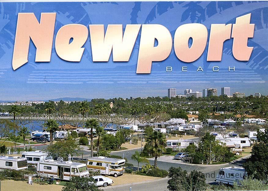 A color photograph postcard of the dunes RV park with Fashion Island visible in the background. The RV park is mostly full and the beach can be seen behind some of the RVs on the left. The word "Newport" is written in large block letters with a golden gradate inside along the top. "Beach" is written in smaller white letters below "Newport". There is a palm-pattern white print behind the wording that resembles a beach.