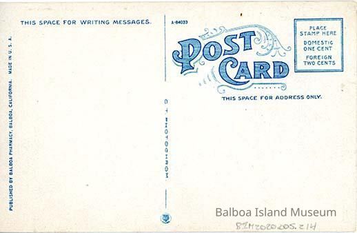 Unused. Divided back. Published by Balboa Pharmacy, Balboa, California. Made in the USA by Curteich-Chicago. Print number A-84033. Triple line Stamp box reads "Place stamp Here Domestic One Cent Foreign Two cents".Subject