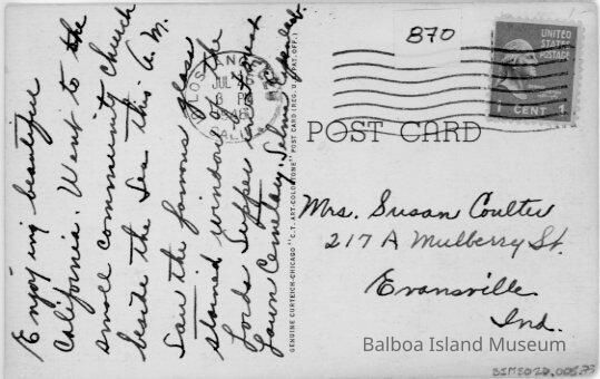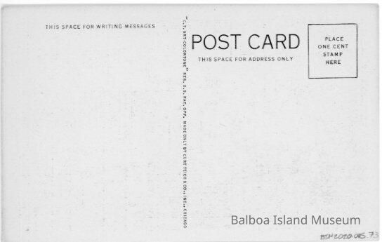Two copies, one sent and one blank. Printed by Curt Teich Co. in Chicago. The sent postcard was sent on July 26, 1946 at 3 PM to Susan Coulter in Evansville, Indiana. There is a slight variation in the design of the back of the postcard, which might indicate they were produced in different years or possibly for different publishers. Printer number 8A-H870. Printed using a five-color printing process onto linen paper from a black and white photograph.Subject