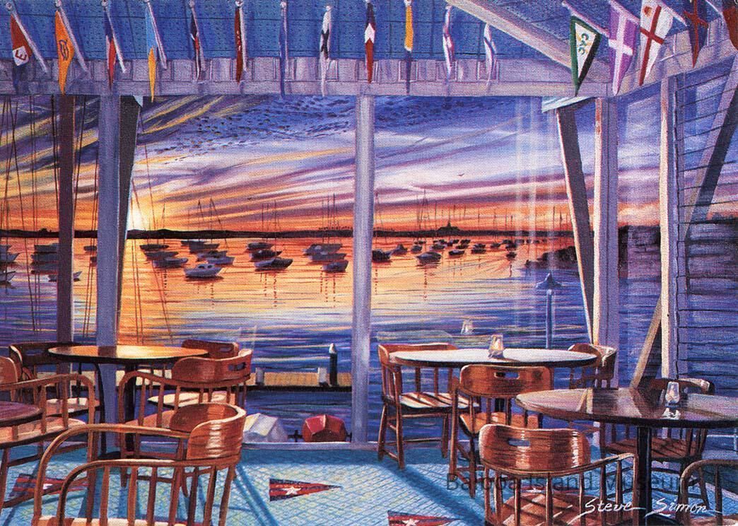A large postcard with an early painting by Steve Simon done in the dining room of the Balboa Yacht club looking out at the harbor at sunset. It was printed as part of a postcard series produce by JIm Barrett, possibly in conjunction with the city or the city visitors services department. The painting is named Balboa Yacht Club.