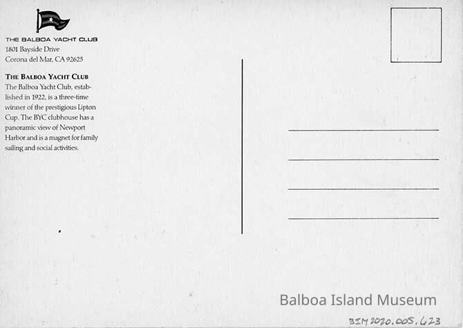 Unused. No publication information. The back has the address and some historic information on the Balboa Yacht Club.Subject