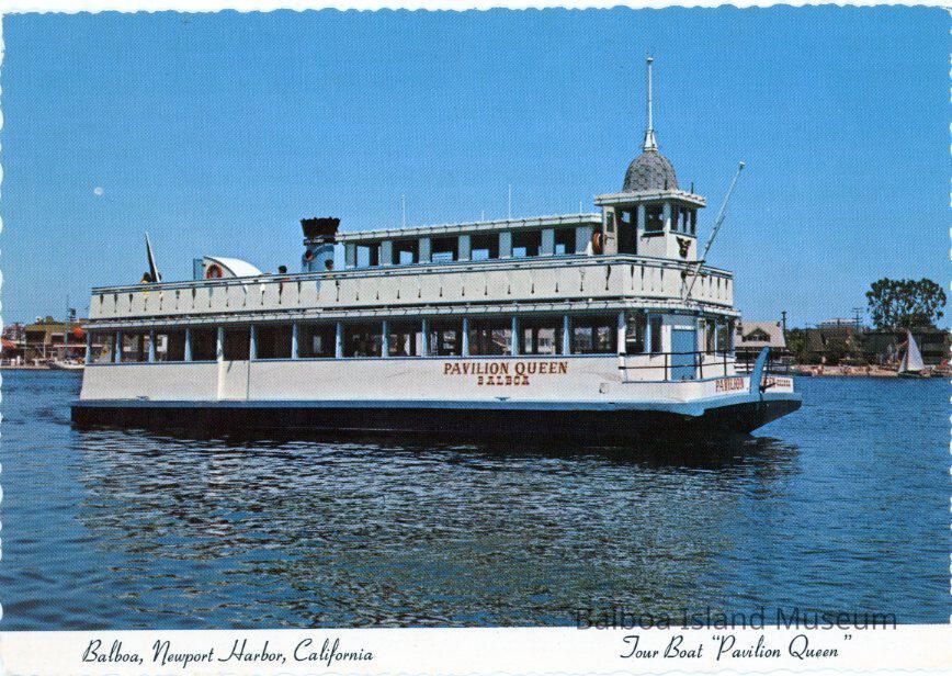 A color photograph of the Pavilion queen out on the harbor in front of Balboa Island (526 South Bay Front is just visible on the right). A white banner on the bottom reads "Balboa, Newport Harbor, California; Tour Boat "Pavilion Queen" ".
