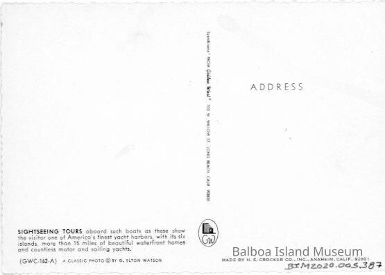 Unused. Published by Golden West in Long Beach. Printed by H. S. Crocker Co., Inc. Photograph by George Elton Watson. Postcard number GWC-162-A.Subject