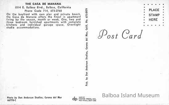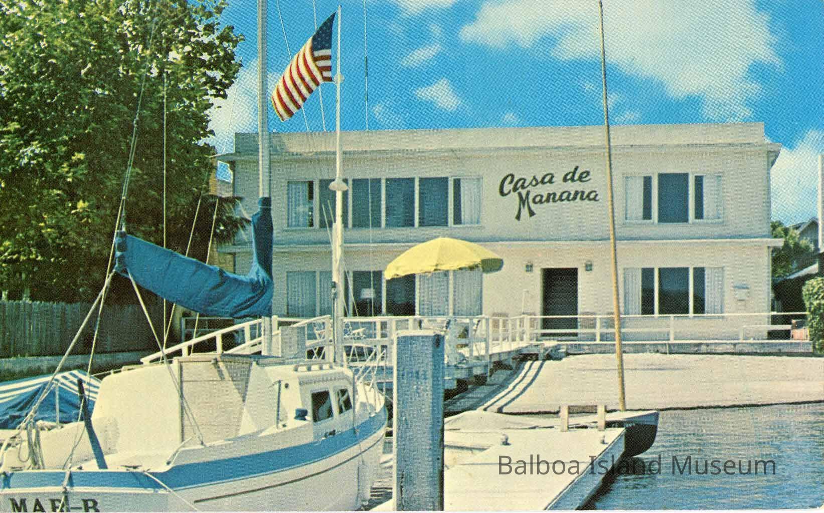 A color photo postcard of the Casa de Manana previously at 1014 E. Balboa Blvd., Balboa, California. This was a beach front apartment cluster. The photograph was taken from the end of the dock, showing both the house and the beach in front of it and two docked sailing ships.