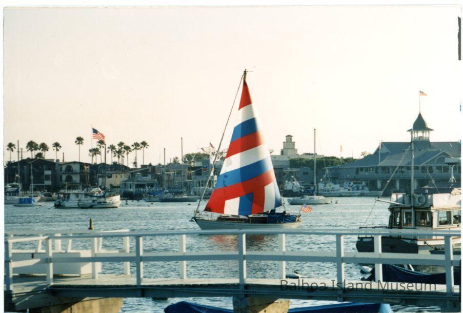 A thick, heavy postcard made locally that appears to be a photograph glued to a piece of backer board. More recent in age. Photograph of a sailboat with a red-white-blue sail on the harbor. The Pavilion is to the right and the tower of the Balboa Inn is visible on the horizon. The Chevron Marine Station is behind the sailnboat.