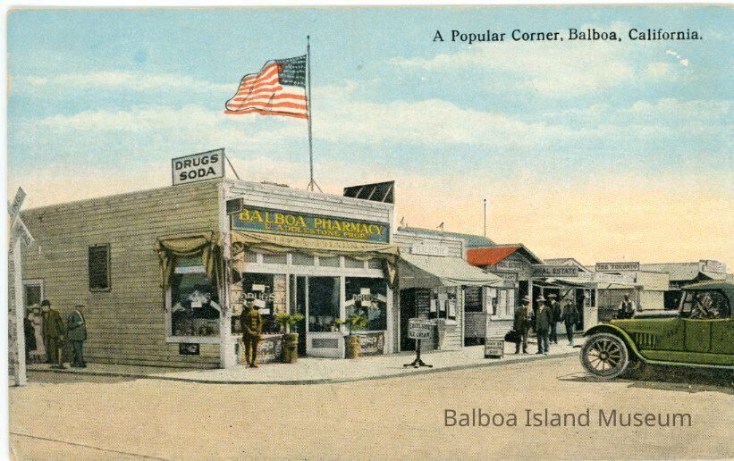 A colorized photograph of the Balboa Pharmacy run by L. Addlestone. The pharmacy had a small sign on top reading "Drugs" and "Soda". There are two real estate offices next to it going down the street. The remaining shops are illegible. There's a railroad crossing sign next to the pharmacy just at the edge of the postcard.