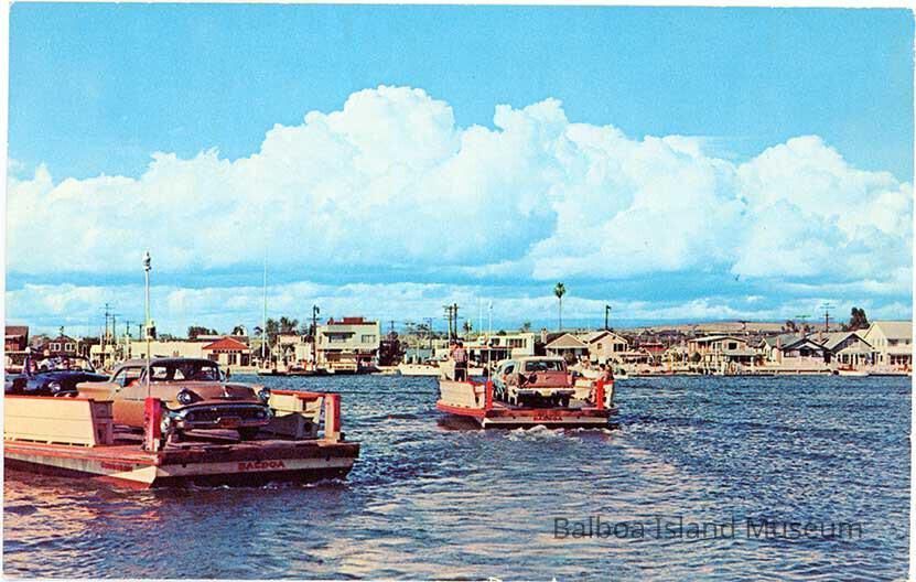 A photograph postcard showing two ferries, Commodore and possibly Joker, passing each other. Commodore is heading towards the Fun zone and the other one is heading towards Balboa Island.