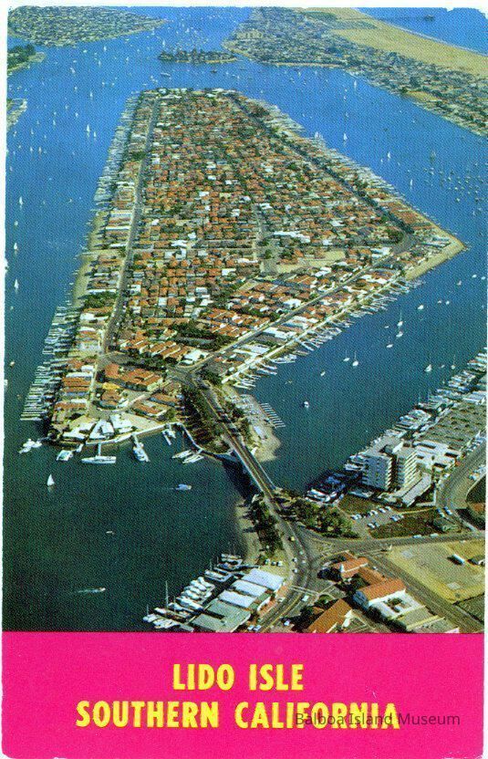A color postcard of Lido Isle from the air with a pinkish-red banner along the bottom that bears the title in yellow.