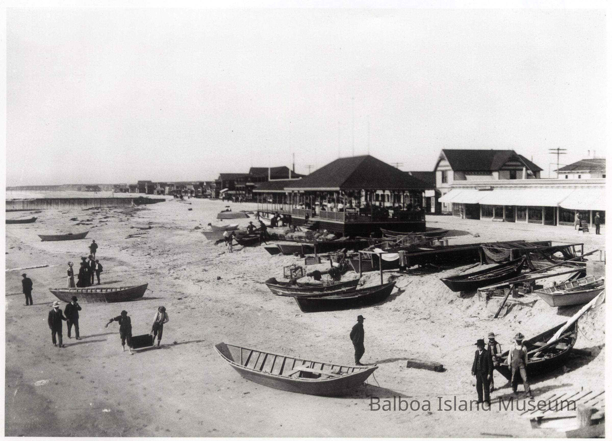 B&W photo of Newport beach showing store fronts and dory boats.Lexicon