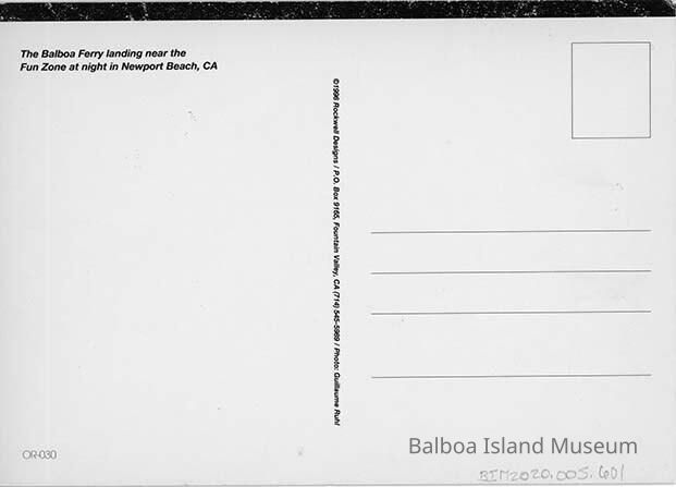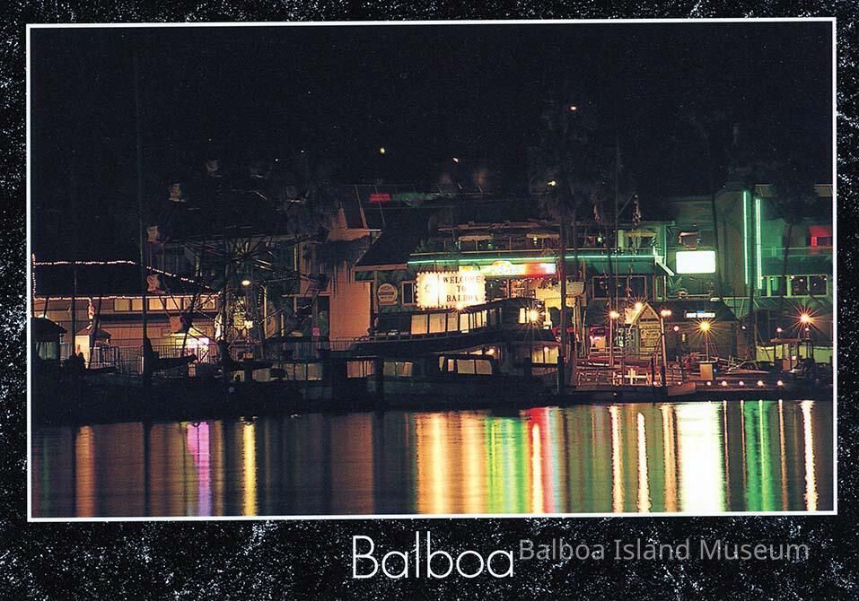 A photograph of the ferry landing on the peninsula side at night. The landing is lit up but the rest of the area is mostly dark. The photograph has a white framed with a black and white marbling behind it. "Balboa" is printed on the front in white.