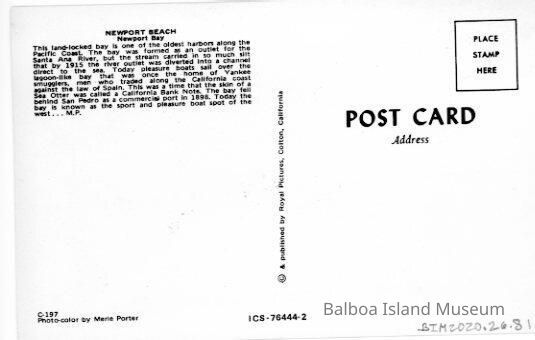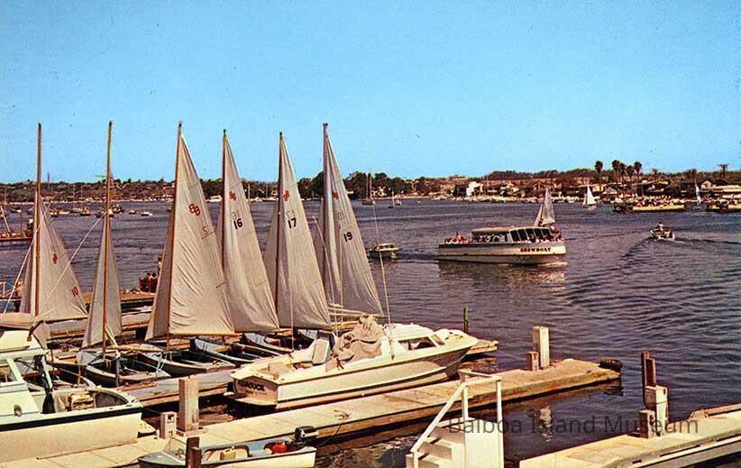 Two copies of a color postcard of the Newport harbor taken from the dock beside the Balboa Pavilion. The boat Showboat is passing by in the harbor. A series of sailboats is docked in one slip and a small power yacht in another.