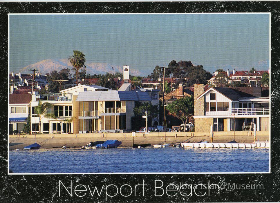 Two copies of a photograph postcard of south Bay Front near the ferry landing, possibly taken from the ferry. Shows the end of Pearl Avenue with the mountains visible in the distance but hazy. Black marbled border with a white frame around the photograph. Newport Beach printed in white below the photograph.