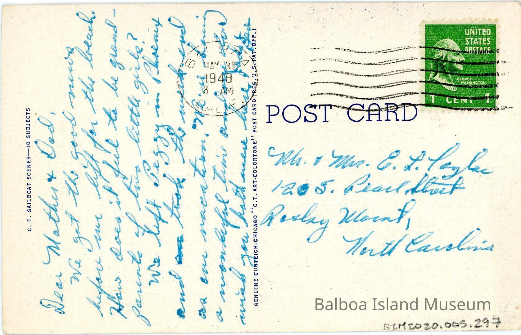 Sent on May 31, 1948 at 8 am from Balboa to Rosky Mount. Published and printed by Curteich-Chicago. Postcard or print number S-454. Linen print. Part of the C. T. Sailboat Scenes 10 Subjects run.Subject