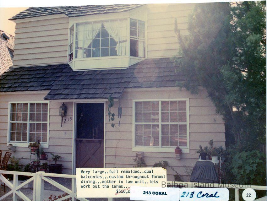 The house is two stories with a shingle roof and wood slide panneling on the sides. There is a bay window on the second floor facing the street and two identical sets of sliding windows to the left and right of the front door, complete with built in ledges beneath for plants or window planters. THe front fencing is white with a six point star pattern inside wooden frames. The house might be the second house at 213 Coral and may well have been torn down so the existing house could be built. Construction is circa 1950s-1970s. A sticker on the front advertises the house as "Very large..full remodelled..dual balconies...custome throughout formal dining...mother in law unit..lets work out terms... $550,000".