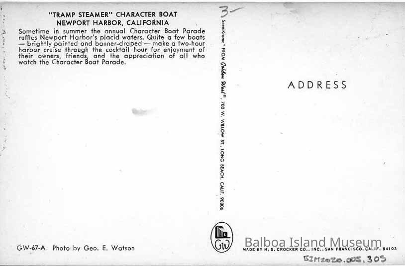Unused. Published and distributed by Golden West, printed by H. S. Crocker Co., Inc. Photograph by George E. Watson. There is a small blurb about the character boat parade in the upper left corner on the back. Postcard number GW-67-A.Subject