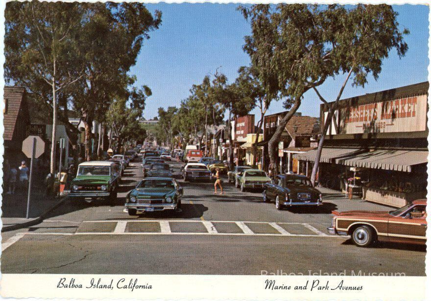 "A color photograph postcard taken from the middle of the 100 block crosswalk at the Marine-Park intersection. Hersey's Market is on the left and Balboa Island Realty is presumably on the right. White boarder on the bottom with ""Balboa Island, California"" on the left side and ""Marine and Park Avenues"" on the right. Scalloped border.