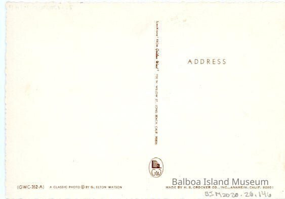 Published by Golden West, printed by H. S. Crocker Co., Inc. in Anaheim, photograph by George Elton Watson. Postcard number GWC-352-A."Subject