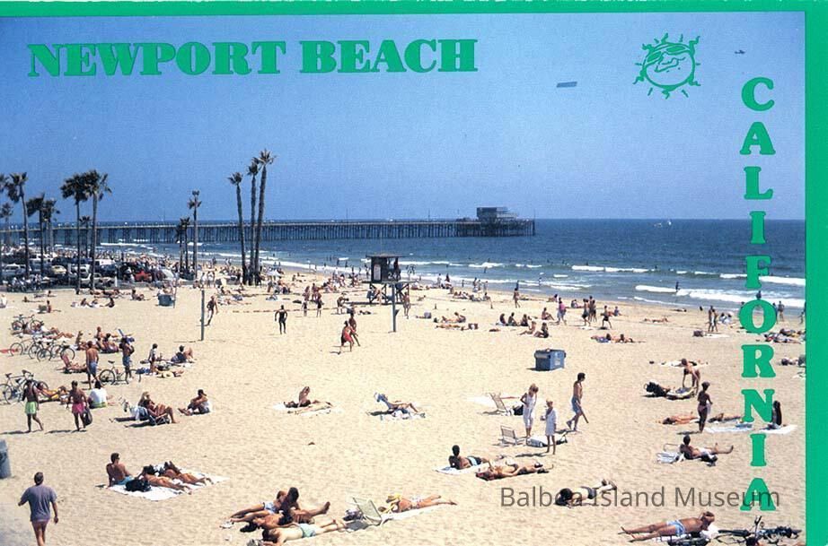 An aerial photograph of Corona del Mar State Beach looking inland towards fashion island and the mountains beyond. Taken from over the ocean looking North. California is written in a stylized font on the front in green with "Corona del Mar, Irvine" written below in green. The photograph is slightly offset with a green border alond the left and top edges.