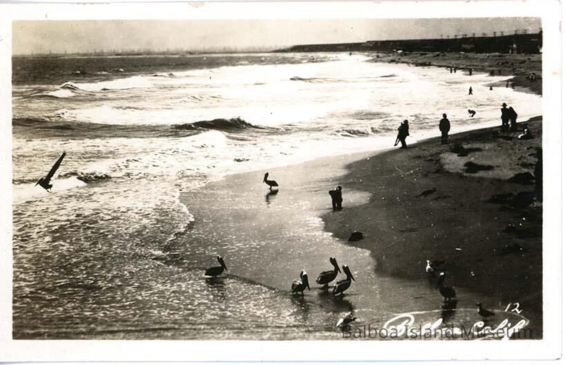 A black and white photograph postcard of the beach near Newport pier with several pelicans and people on the shore. There are oil rigs along the horizon in the back.