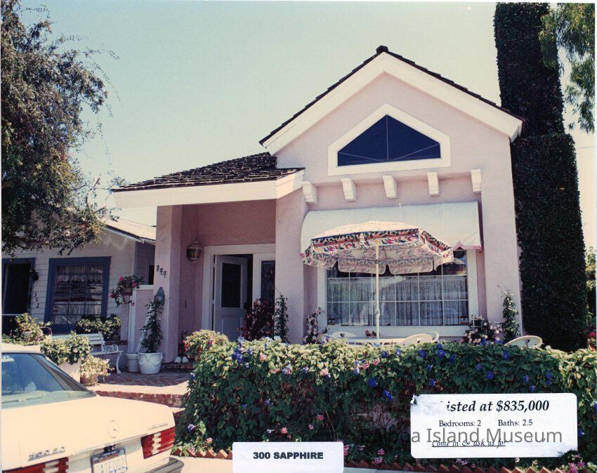 A photograph of a single story house at 300 Sapphire avenue, cross street Balboa Avenue. The ouse is pink with a large front window and a small trapazoidal window set into the area below the front peak of the house. There is a double fornt dor in the alcove to the side where the front double doors are located. A small porch lamp is attached to the left wall insid ethe alcove. The front patio is made of bricks and the front wall and fire place are covered in vines and creeping plants.