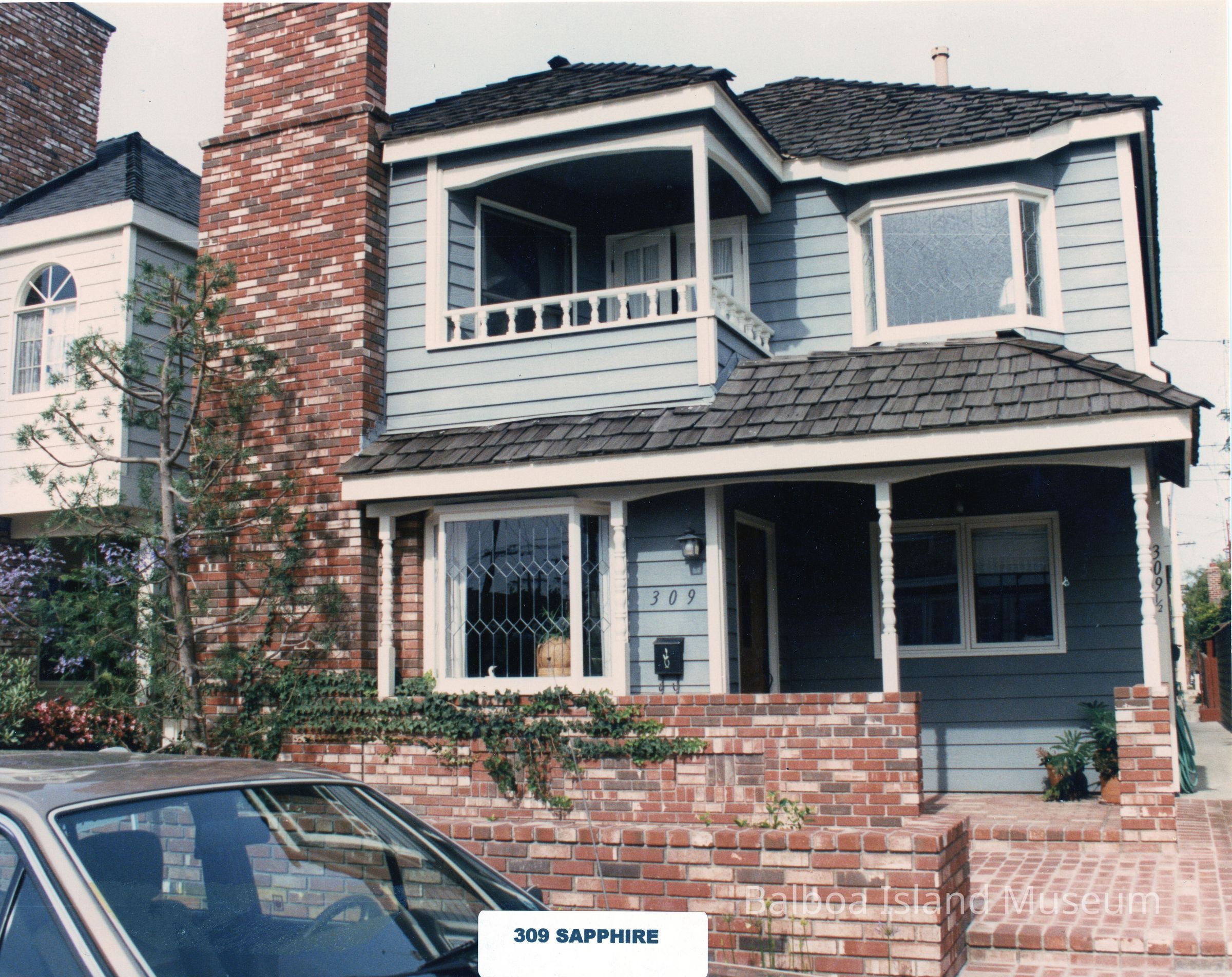 A photograph of a two story house at 309 Sapphire. The house has a front baywindow with diamond-cut glass in it and a small square deck above it. A dubplicate bay window is set in the second floor beside the deck. The front door is at a right angle to the front wall of the house, set into an alcove space beneath the porch roof. The house foundation, front steps, and the lower half of the front wall are covered in brick as is the fireplace that runs up the left side of the front wall. The porch is held up by carved supports. Likely the second house on the property.