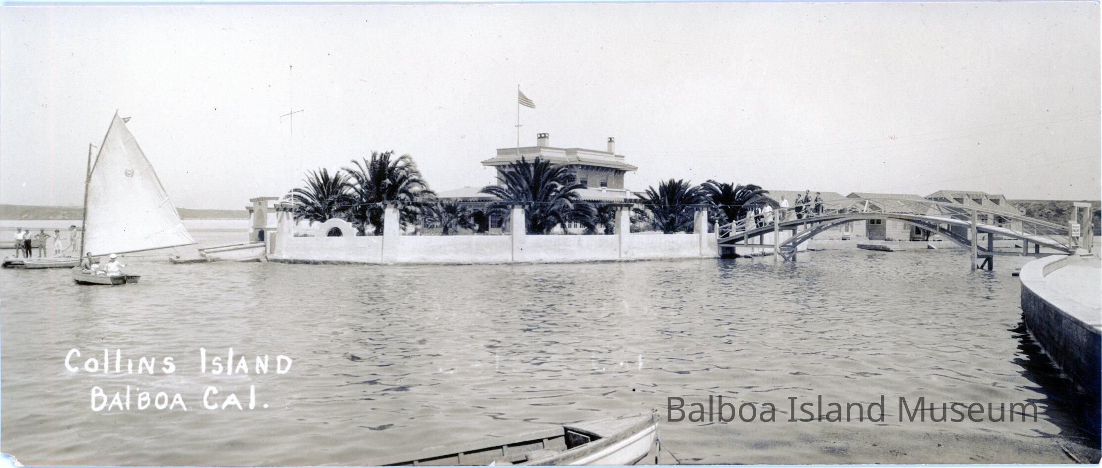 A long photograph of Collins island taken from just off South Bay Front, probably from a dock. There is a sailboat heading into the dock on Collins Island near the back and some people standing on the bridge to Collins island. The sailboat appears to be flying the Balboa Island Yacht Club burgee.Photograph Details