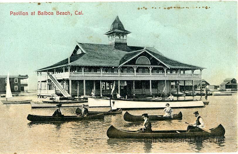 A colorized photograph postcard of people in front of the Balboa Pavilion in canoes and boats. There is a slide attached to the side of the Pavilion leading into the water from the second story. There are very few other buildings visible around the Pavilion.