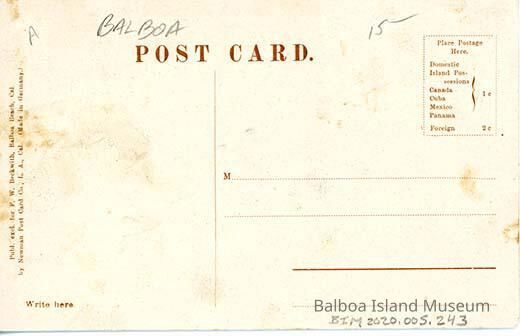 Unused, divided back. Published for F. W. Beckwith, Balboa Beach by Newman Post Card Co, in Los Angeles. Made in Germany. The right address side contains lines for the name and address information. The stamp box has a dotted border and reads "Place Postage Here. Domestic, Island Possessions, Canada, Cuba, Mexico, Panama cent, Foreign 2 cent".Subject
