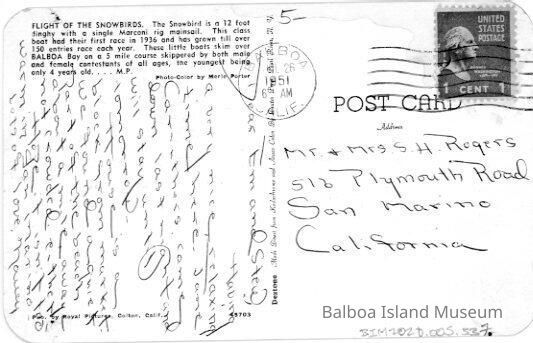 A color postcard of the flight of the snowbirds as they pass in front of the hills near Balboa Island. There is a man in a red canoe on the left. The postcard had rounded edges.