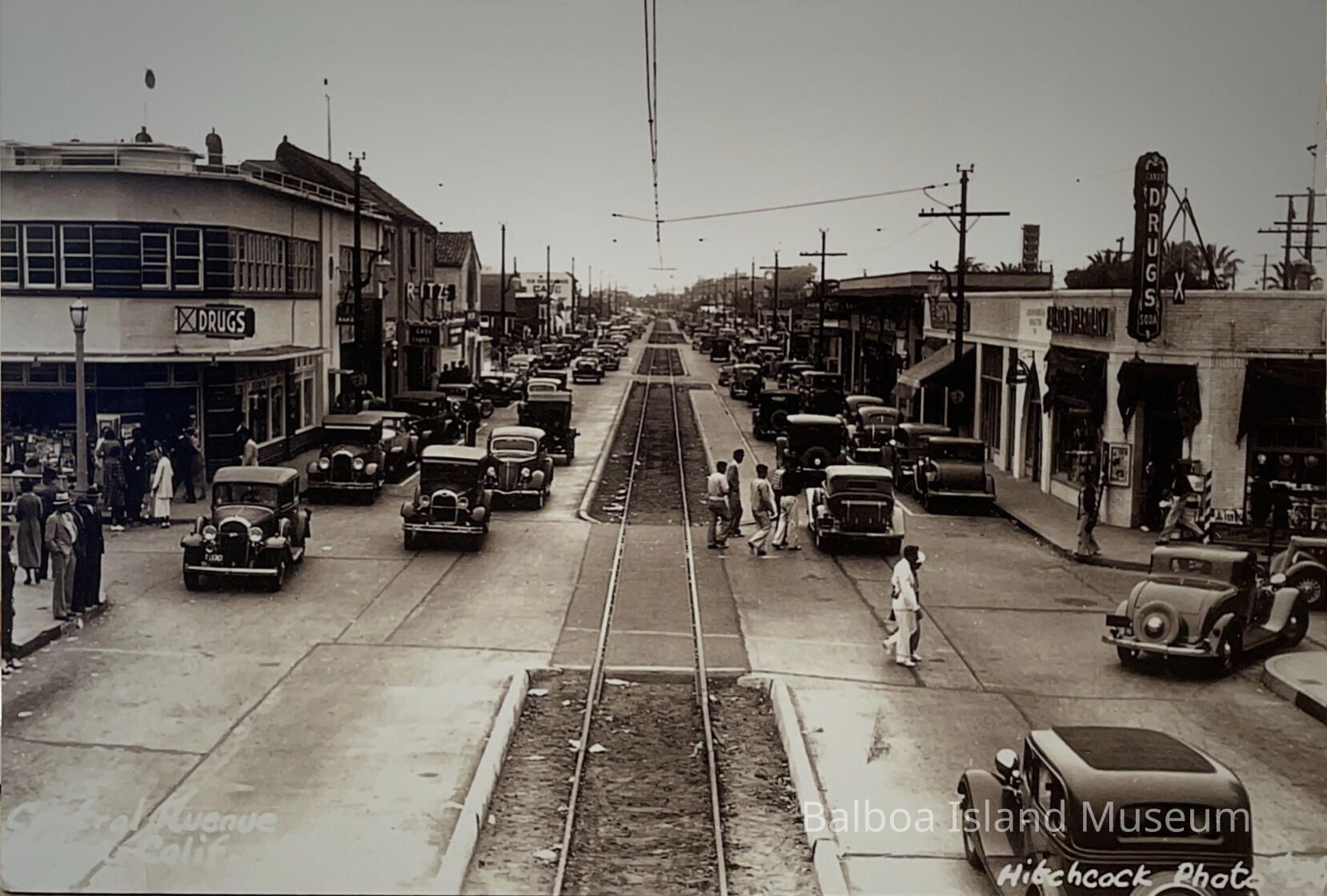 A large blown-up photo of Balboa Peninsula looking West on East Balboa Blvd. in 1936. The redline tracks and the pharmacy are visible. The Pavilion would be on the right-hand side of the photographer. McCoy Drug Company on the left was previously the Green Dragon that had been on that corner from 1924-1935 and Balboa Pharmacy on right.