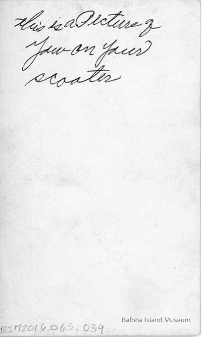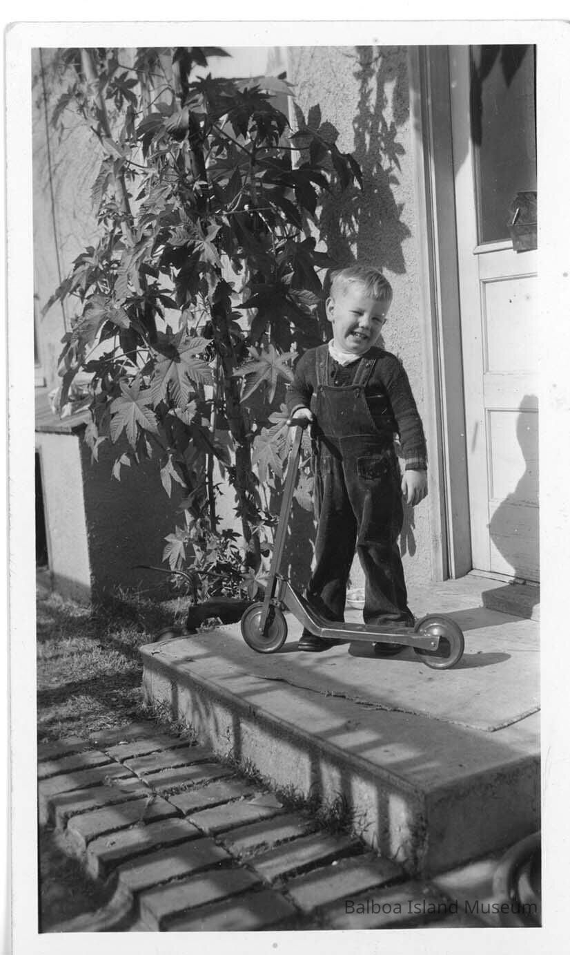A photograph of Rolly Polaski on the front step of a building with his scooter. He is maybe 3 or 4 and standing in front of a small tree. There is a door, presumably the front one, on the right side.
