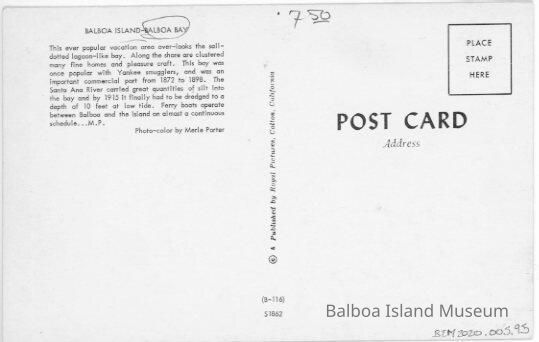 The back is a standard postcard layou7t. There is a blurb in the upper left hand corner about the Balboa island Bay. The photograph is by Merle Porter. Published by Royal Pictures in Colton, California. Postcard number B-116 or S1862.Subject